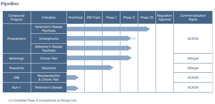 ACADIA Pharmaceuticals, es una compañía biofarmacéutica que utilizando tecnología innovadora, trabaja en el desarrollo, impulso y descubrimiento de fármacos para nuevos tratamientos que puedan solucionar todo tipo de desórdenes del sistema nervioso. Tienen cuatro productos en distintas fases de desarrollo clínico incluyendo“pimavanserin”, que se encuentra en fase III, que serviría para el tratamiento de la psicosis producida en la enfermedad de Parkinson. Tienen otros productos en Fase II y fase I, para el dolor crónico y tratamiento del glaucoma, ambos en colaboración conAllergan, Inc., y PM-831, este último en Fase I que sería para el tratamiento de la esquizofrenia con la colaboración de Meiji Seika Pharma Co ., Ltd.