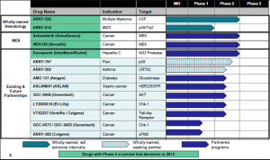 La línea de desarrollo de drogas incluye candidatos clínicos que están diseñados para regular terapéuticamente importantes vías de destino. Candidatos en distintas fases de desarrollo de la compañía, son los siguientes: AMG 151, MEK162, ARRY-380, ARRY-520, ARRY-543 y ARRY-614.