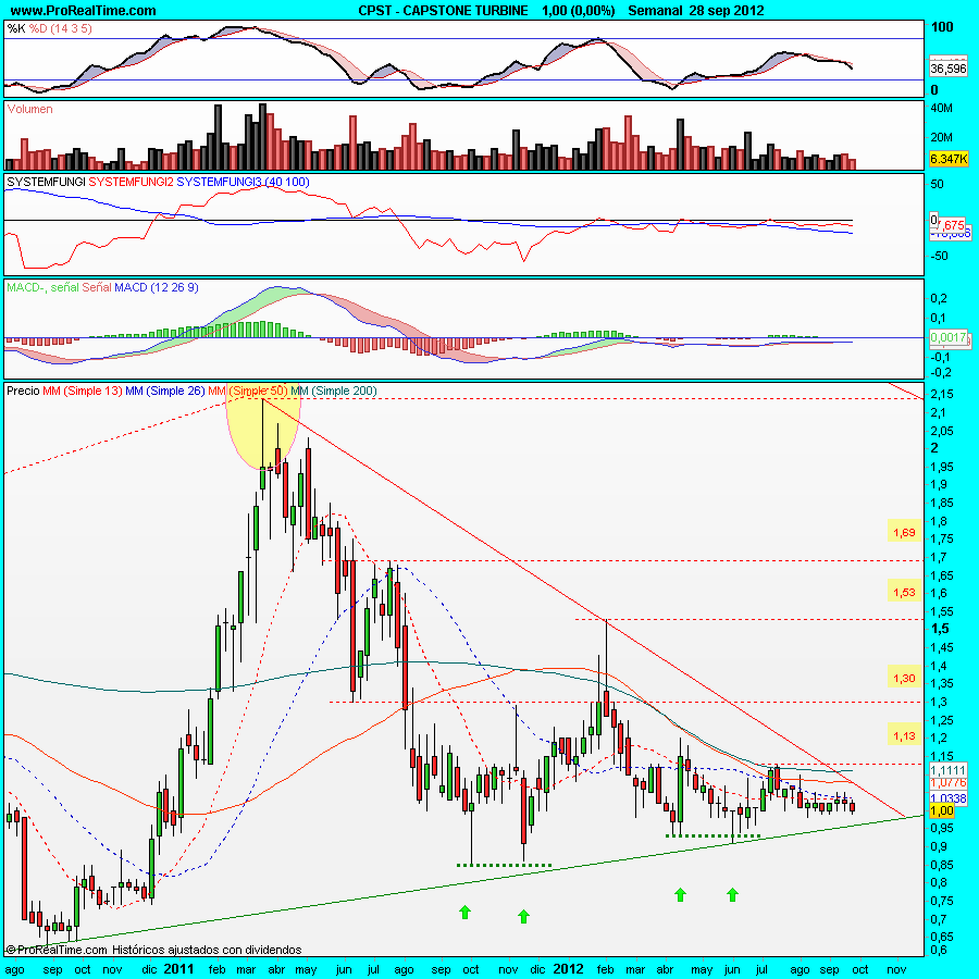 Le tengo cariño a este precio, no lo puedo ocultar, no tanto como Toni, pero cerca le anda; No puedo evitar echarle un ojo de vez en cuando y en estos momentos creo que la lateralidad en la que está sumido desde hace unos meses, casi un año, está a punto de terminar; Los indicadores de largo plazo nos están enviando señales de que algo está cerca de suceder; La empresa lleva re-estructurándose un largo periodo de tiempo, poco a poco, lenta pero sin pausa todo indica que lograrán salir del bache; Puede que tengamos pronto una sorpresa positiva.