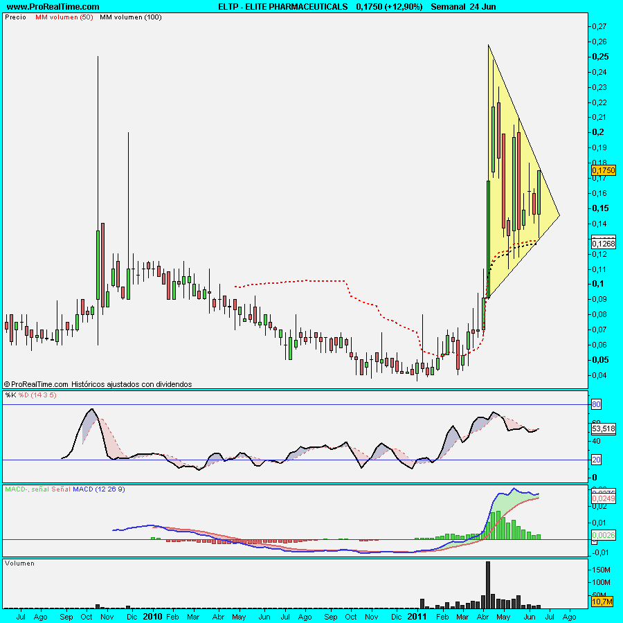 Hace mucho tiempo que no dedico una entrada a un valor que se encuentra en la cueva de Alí Baba. es una pharma que seguí hace mucho tiempo y que estuvo muy cerca de pillarme en su bajada a los infiernos. Hoy me pregunta Félix por ella y viendo su gráfico y el volumen que mueve a pesar de donde cotiza, me he decidido a hablar de ella «de nuevo». Ahora su cotización está conformando una figura técnica muy conocida y bastante común, como es un triángulo regular que puede ser perforado a la baja o superado al alza. Esto puede ser interesante de seguir y estando al mando de «los cuarenta ladrones», como os podéis imaginar, los porcentajes de subida y bajada pueden ser no aptos para corazones débiles.