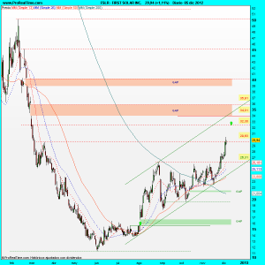 «HIPÓTESIS “A”.-Como es de suponer, conlleva la confirmación de la figura y por tanto se acabarían las penas para este valor, hecho que podría arrastrar al resto de compañeros que llevan sufrido lo mismo o en muchos casos mas aún; Este deseado acontecimiento traería consigo la búsqueda por parte del precio de ese primer gap pendiente de cerrar por arriba entre los 34,01 y 35,91 dólares por papeleta; Para quien contemple esta situación y como es obvio al encontrarse el precio en la zona baja del triángulo, sería indudablemente una zona de entrada la actual, inmejorable, ya que solo quedaría la posibilidad de subir y subir. Siempre atentos por si se produjese esa perforación que nos haría salir por pies para proteger nuestra inversión.