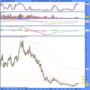 JASO.-(Ja Solar Hold.).-Esta cotización considero que aún no ha saltado, pero lo hará y cuando lo haga, veremos velas similares a las de SPWR, como el tiempo se encargará de demostrar.