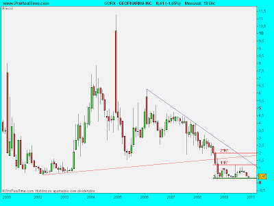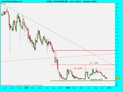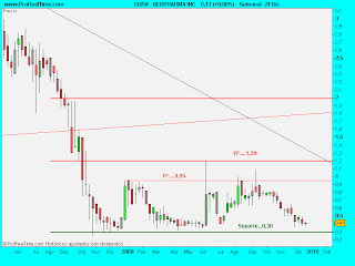 de 1,20. Pero tener en cuenta que entre 0,30 y 0,95 se multiplica ¡nada menos! que por tres, por lo tanto ¡mucho ojo! y ¡mucha atención! a este precio. Lo traigo simplemente para que el que quiera lo siga y esté atento a una posible entrada entre 0,30 y 0,35. A tener en cuenta que los que manejan el precio ya saben que habrá muchas «cañas de pescar» preparadas para intentar entrar dentro de ese margen y normalmente en estas situaciones se suelen quedar a algún centavo de lo que nos marcan las lineas. Con absoluta seguridad veo que es una muy buena oportunidad de importantes plusvalías en poco tiempo, espero no equivocarme, no obstante como siempre digo, allá cada cuál con su dedo, que ese si que es peligroso.