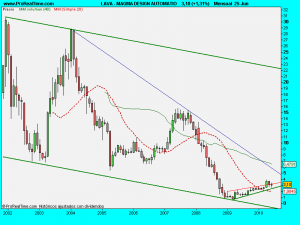 LAVA: De momento ha bajado hasta los 2,91 y si perfora los 2,86, perforaria una linea de tendencia alcista vigente desde el 20 de julio de 2009, zona peligrosa a vigilar, esa zona de los 2,86, ya que o rebota o perfora y baja.