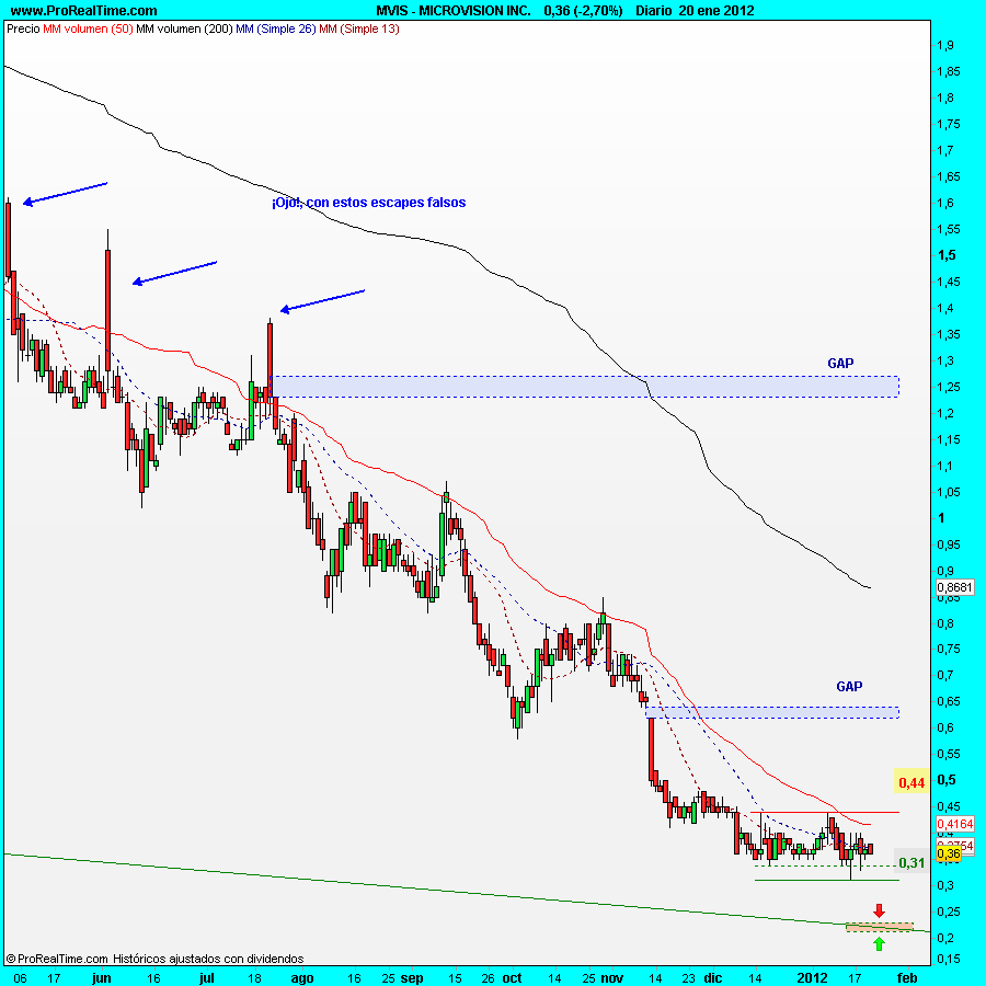 Vamos a ver Jesús que vas a acabar conmigo….¡es broma!; Yo esta ni la miraba hasta que no se den una serie de condiciones: Superación al cierre diario de 0,44 usando ese nivel como barrera de protección; Entrada entre 0,31 – 0,35 y con stop en 0,30 al tic y a cuchillo; Por último si se diera el caso, un par de centavos antes de tocar la bajista con stop entre dos y tres centavos por debajo.