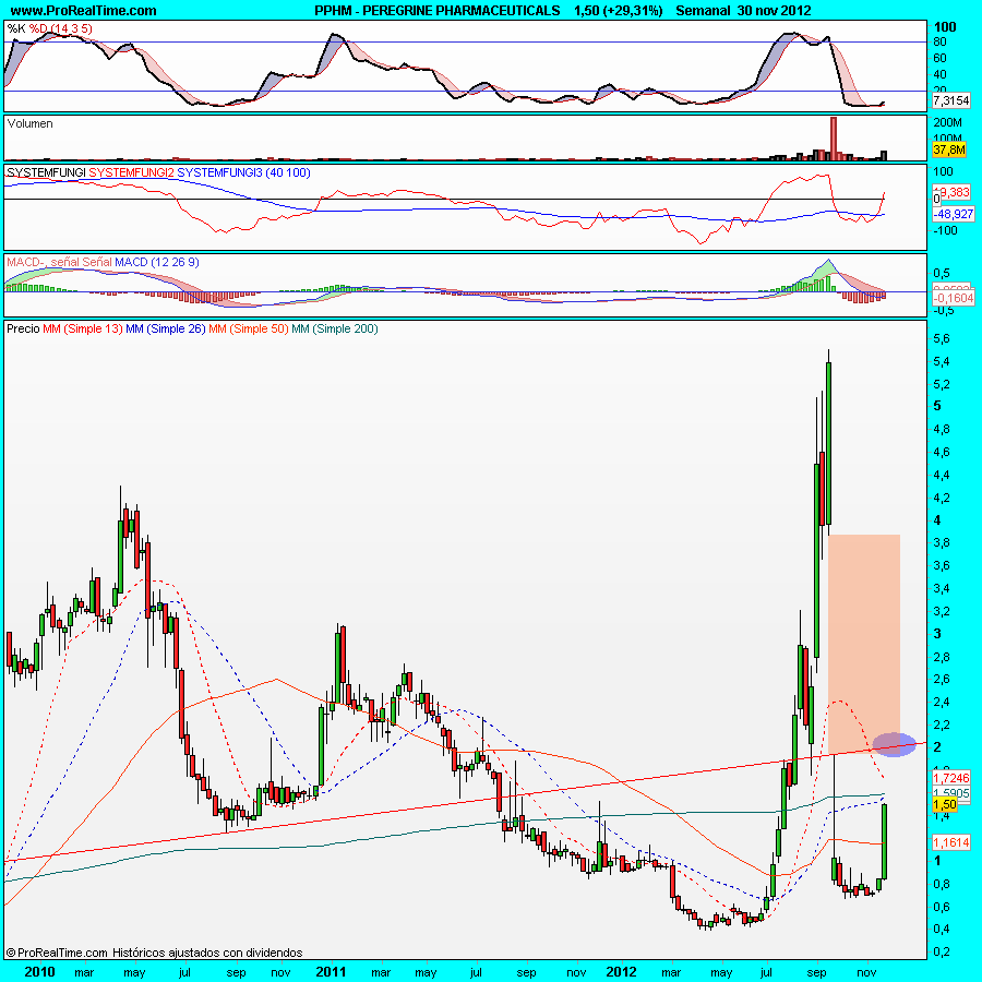 Antes de tomar la importante determinación de dejar al dedo en libertad para ejecutar una compra, debemos analizar donde nos metemos y con que intenciones u objetivos; Digo lo anterior porque recordar que Peregrine estuvo y no se si sigue estando en investigación por potencial manipulación de datos sobre sus ensayos clínicos e incidencia en los pacientes tratados con su medicamento en desarrollo; Eso llevó a la cotización a dar un gran salto pasando en tres meses pagarse por el mismo cromo 0,42 a 5,50 dólares, para en una misma semana, la que marcó esos máximos, de un día para otro caer por debajo del dólar. ¡Ojo a este y otros detalles antes de tomar posiciones!.