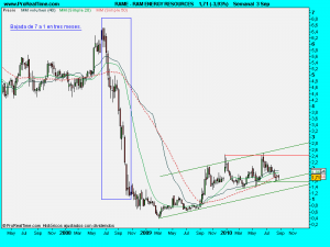 Poco después ha ido buscando su suelo, que pienso que ya hizo en 0,40 para comenzar una vuelta en la que va conformando un canal alcista con una base y un techo de momento bastante claros.