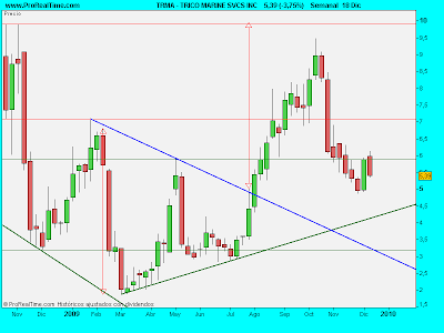 La esperaba por ahí porque esperaba dos cosas por parte del precio: Que fuera a tapar el hueco que tiene en diario y o que tanteara la linea alcista que llevamos. Ninguna de esas dos cosas ha hecho y ya que estás dentro, ¡ojalá! no las haga, aunque yo me mantengo en mi creencia. Los indicadores en diario tienen buena pinta y salvo el volumen que de momento no acompaña, siendo hoy el día, de momento, más bajo de los tres últimos. Aún no voy a entrar, no porque sea mala opción, porque mi opinión sobre ella, es fácil de saber, con solo seguir el hilo, sino porque en este momento barajo cuatro opciones más a cuál de ellas más interesante, y que en su debido momento, si no se escapan, informaré de ello. No obstante actualizo el valor con sus gráficos en diario y semanal, deseando toda la suerte del mundo, a tí y todos los que estéis en el valor.